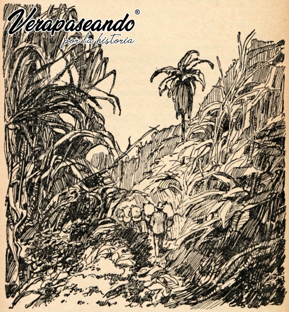Encima de la carga se coloca además una gran lona impermeable, que también se amarra, y entonces comienza la marcha en una larga caravana (nosotros teníamos 30 animales), uno detrás de otro, a través de bosques y matorrales, sobre montañas y cruzando ríos, durante tres días, hasta llegar a un pueblo en la llanura. Desde allí, la carga es transportada en carretas tiradas por bueyes (otro viaje de varios días) hasta el puerto.