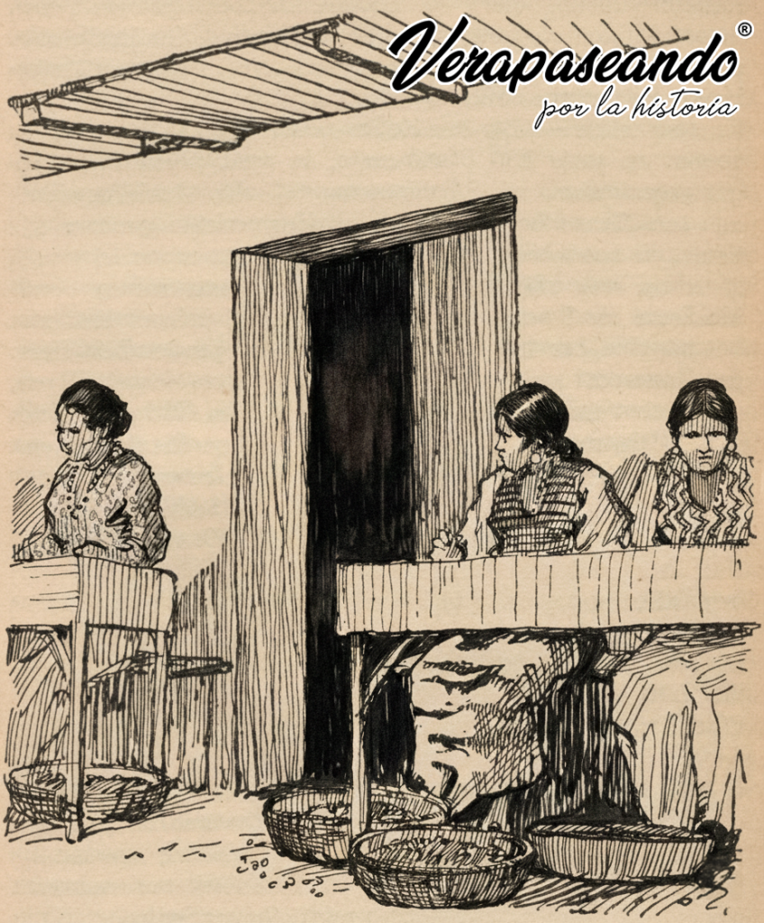 Los aparejos también se apilan y se cubren. De la “cocina” que se transporta en uno de los animales (una caja de madera común, de tamaño mediano, con tapa) se sacan: una olla esmaltada con asa y cadena, una bolsita de frijoles, un pequeño hervidor de agua, algunos platos de hojalata, tortillas (panes de maíz), café, azúcar morena y quizá también un poco de aguardiente. Los frijoles ya están algo cocidos y ahora se cuelgan, en una cadena, sobre el fuego, en un alto trípode hecho de tres varas, mientras el bosque proporciona la leña, más o menos seca. El hervidor de agua se coloca junto al fuego y las tortillas se calientan sobre una vara de madera verde o en un asador de alambre.
